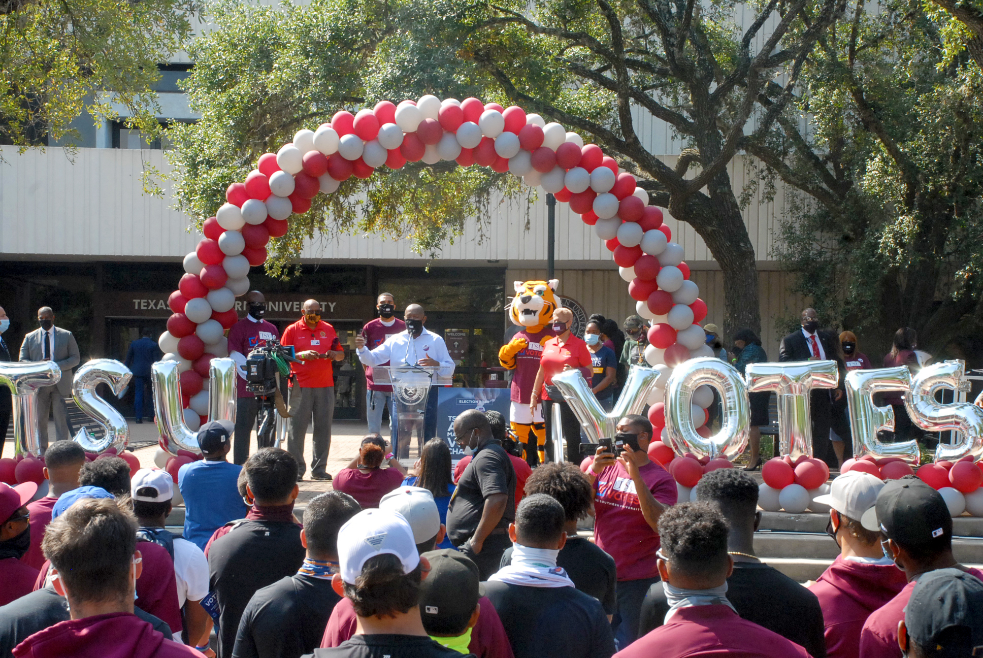 Following the university’s famous Ocean of Soul Marching Band, students marched from University Towers to the West Garage, where a polling location in stationed. Brief remarks were provided by Houston Mayor Sylvester Turner, TSU Interim President Ken Huewitt, U.S. Congresswoman Sheila Jackson Lee, Houston Council Member Dr. Carolyn Evans-Shabazz, TSU Student Government Association President Khaniya Burley, and others on the historic Tiger Walk.