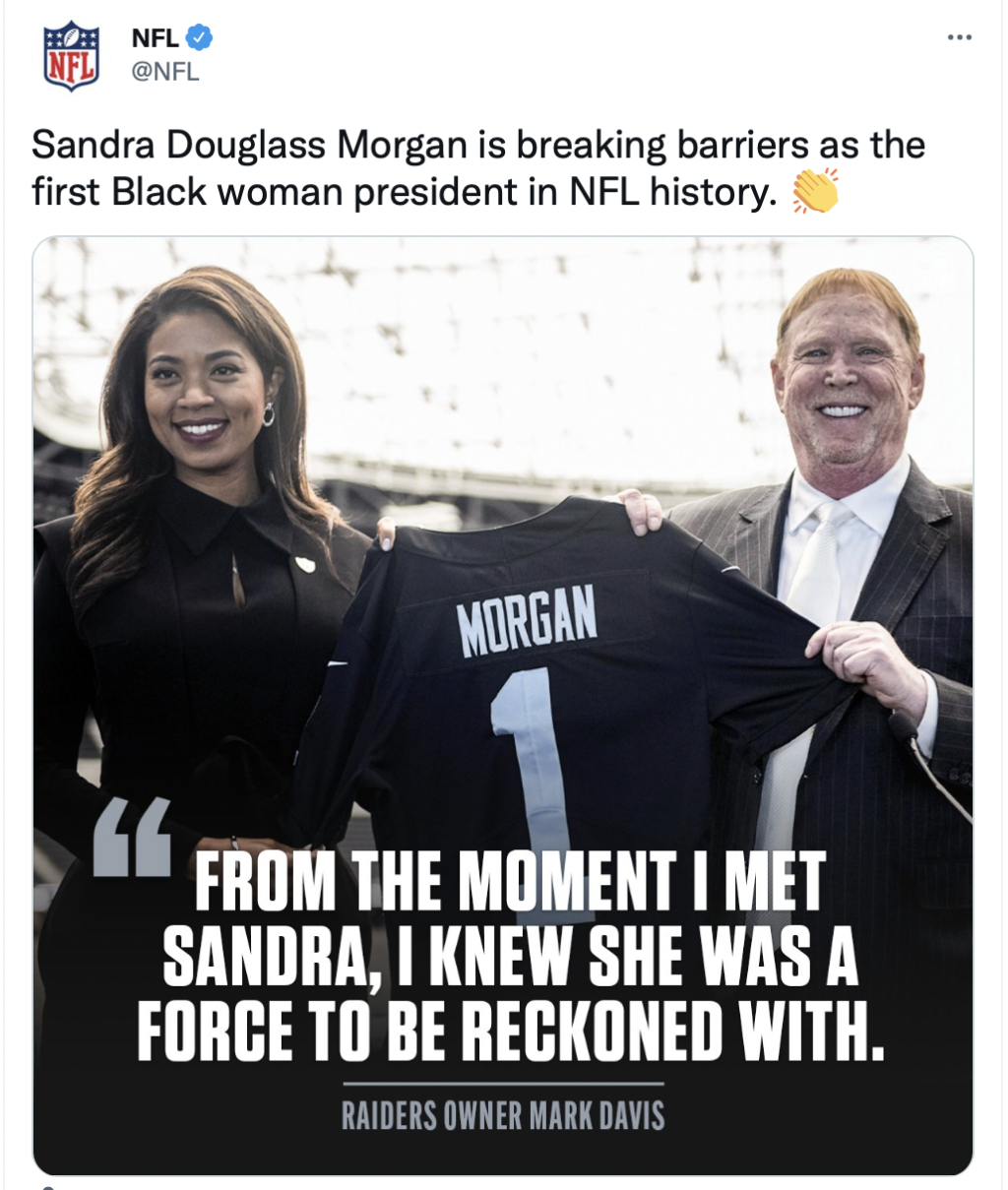 “Congratulations to our Alpha Kappa Alpha, Inc. Theta Theta Omega Chapter Soror Sandra Douglass Morgan on being named President of the Las Vegas Raiders and becoming first black female President in NFL history. We are very proud of her,” they captioned their post.
