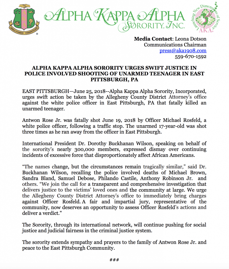 Alpha Kappa Alpha Sorority, Inc. released a statement from their national headquarters today urging for “swift justice” in the police involved shooting of Antwon Rose Jr., an unarmed Black teenager in East Pittsburgh, PA.