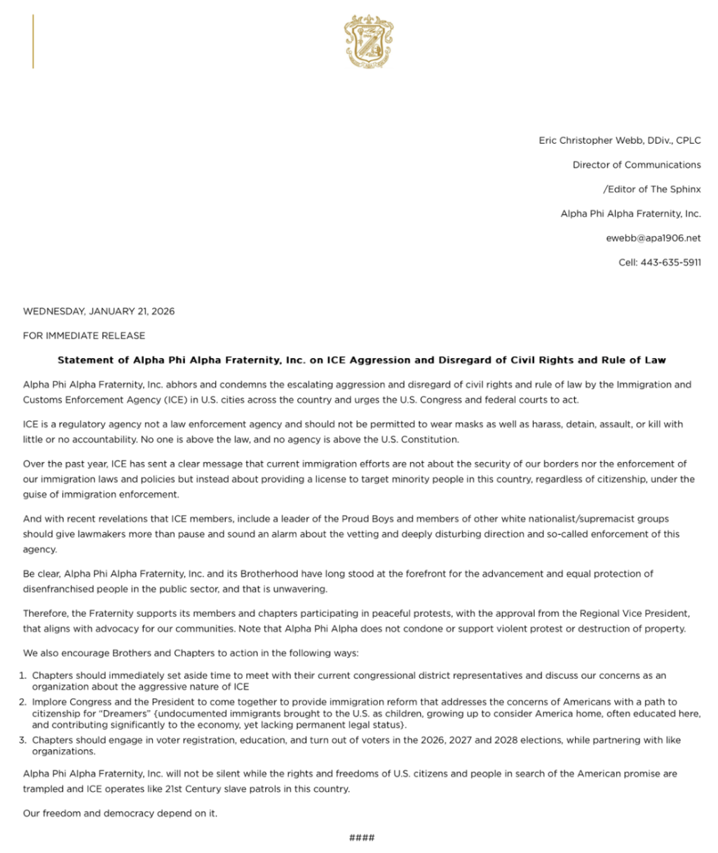 The fraternity asserted that recent immigration enforcement efforts have moved away from border security and lawful policy enforcement and instead have resulted in the targeting of minority communities, regardless of citizenship status. Alpha Phi Alpha also cited recent reports alleging the presence of extremist affiliations within ICE, calling those revelations deeply troubling and deserving of urgent scrutiny.