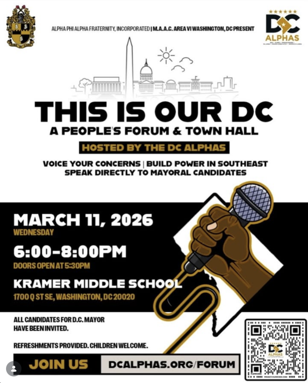 The event, titled “This Is Our DC: A People’s Town Hall and Forum,” will take place on Wednesday, March 11, 2026, from 6:00 p.m. to 8:00 p.m. ET at Kramer Middle School, located at 1700 Q Street SE in Washington, D.C. Organized by Area VI of the Mid-Atlantic Association of Alpha Phi Alpha Chapters, also known as the DC Alphas, the free event aims to create space for meaningful dialogue between District residents and candidates running in the city’s mayoral race.