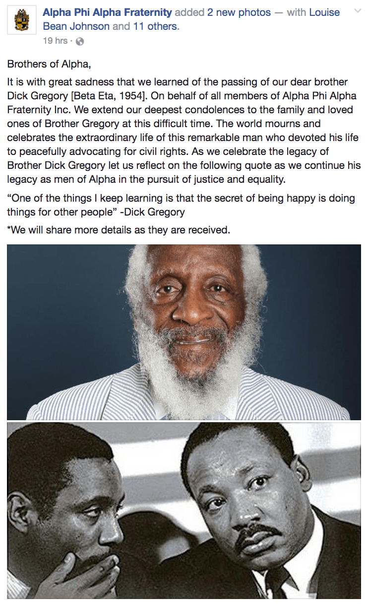 We are saddened to announce the loss of our beloved Brother Dick Gregory. His legacy and influence will live on forever more. ?? #AΦΑ pic.twitter.com/KG7JMz2kc8