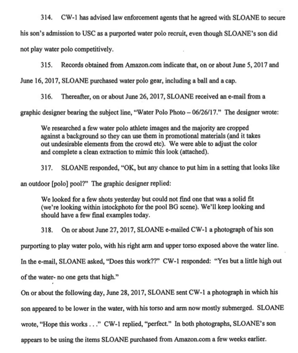 In many cases, student’s faces were photoshopped into pictures of actual athletes playing sports to boost their applications and prove to the universities that they were actual athletes. An article released by Deadspin highlighting the FBI documents shows that one particular student who had been recruited by USC’s polo team had never played polo before and didn’t even have a polo team at his high school. The investigation found that the parent was instructed by the admission consultant to go on Amazon and buy water polo gear and take a photoshoot so that he could be photoshopped into action shots. Amazon confirmed the receipts of purchase.
