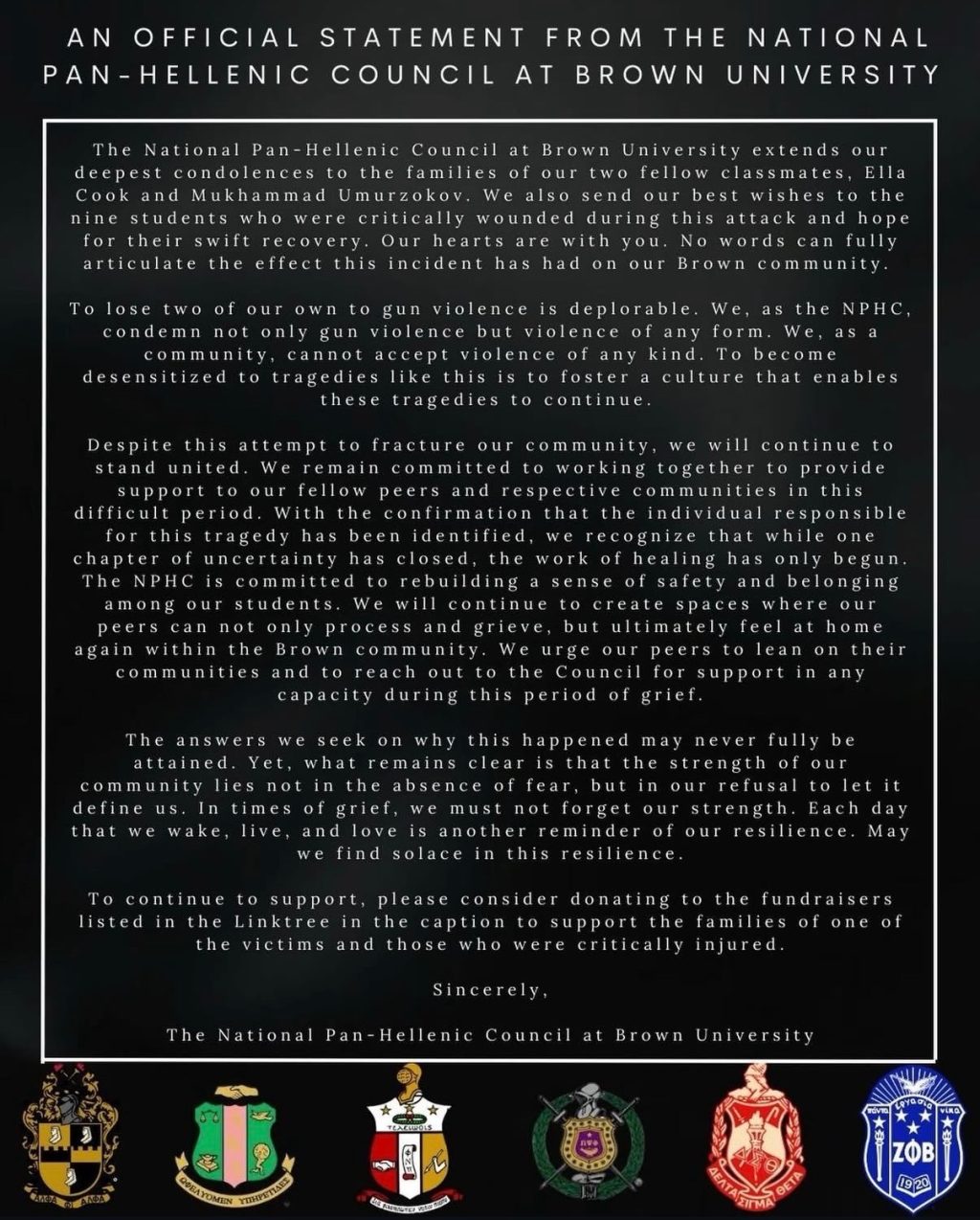 The National Pan-Hellenic Council (NPHC) at Brown University has released an official statement following a tragic shooting that occurred on campus Saturday afternoon.