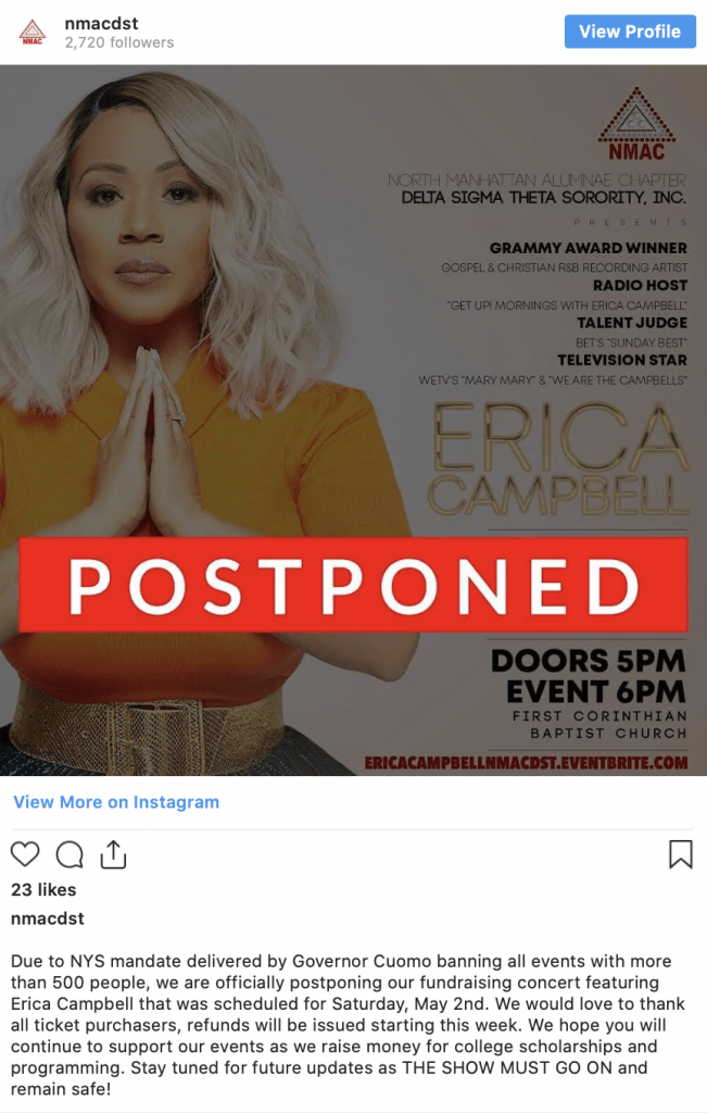 Delta Sigma Theta Sorority, Inc.’s website states that all tours of their National Headquarters are suspended until further notice. The North Manhattan Alumnae Chapter of Delta Sigma Theta has also postponed their fundraising concert featuring Grammy Award winner Erica Campbell.