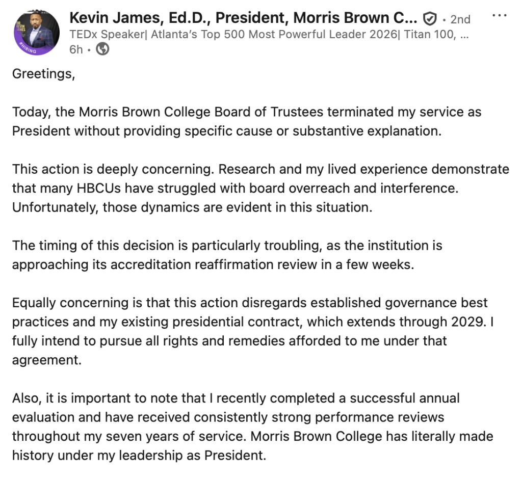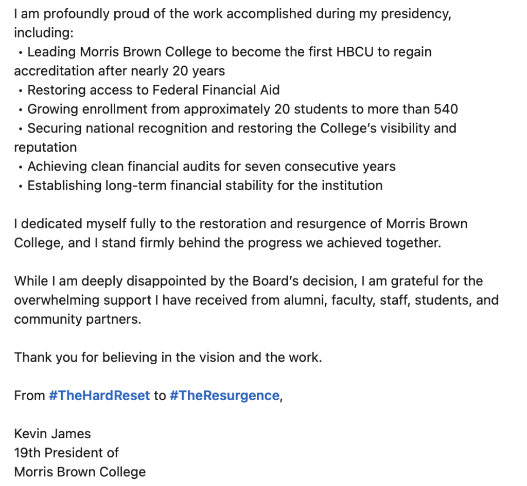 “I dedicated myself fully to the restoration and resurgence of Morris Brown College,” James wrote, adding that he stands behind the progress made during his leadership. While expressing disappointment with the Board’s decision, he thanked alumni, faculty, staff, students, and community partners for their support.