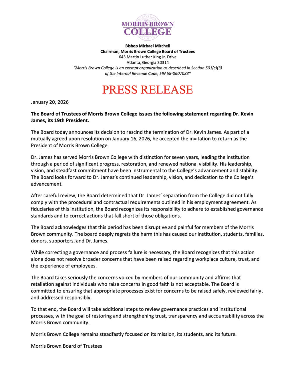 The board also acknowledged the impact of the situation on the campus community. “The Board acknowledges that this period has been disruptive and painful for members of the Morris Brown community,” the statement said, adding that it “deeply regrets the harm this has caused our institution, students, families, donors, supporters, and Dr. James.”