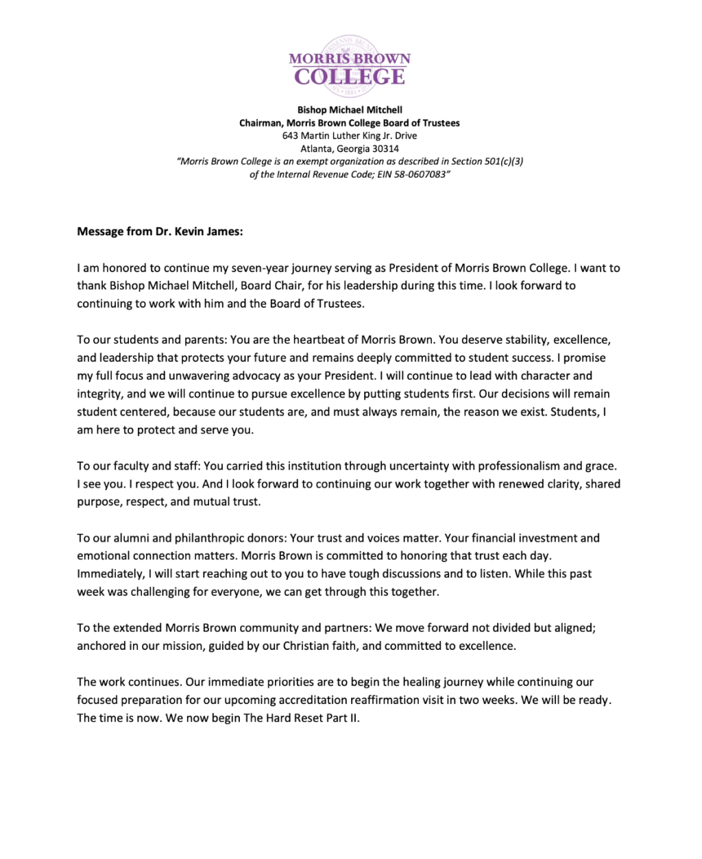 Dr. James also issued a message following his reinstatement, expressing gratitude and reaffirming his commitment to the college. “I am honored to continue my seven-year journey serving as President of Morris Brown College,” he said. He thanked Board Chairman Bishop Michael Mitchell for his leadership and said he looked forward to continuing to work with him and the Board of Trustees.