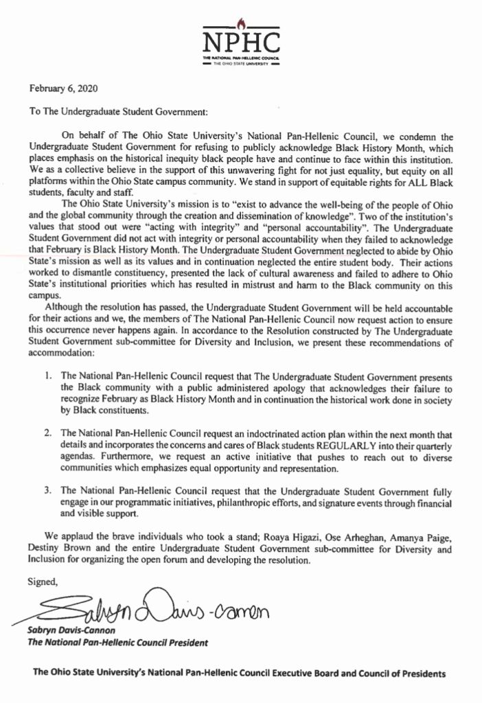 The National Pan Hellenic Council at Ohio State University released a statement Thursday condemning their school’s undergrad Student Government Association for not acknowledging Black History Month.