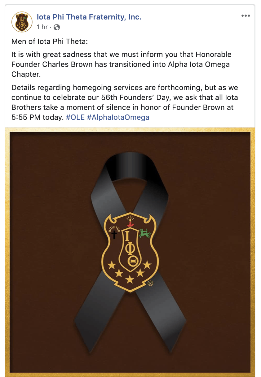 “Details regarding homegoing services are forthcoming, but as we continue to celebrate our 56th Founders’ Day, we ask that all Iota Brothers take a moment of silence in honor of Founder Brown at 5:55 PM today. #OLE #AlphaIotaOmega ”