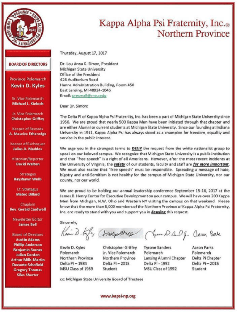 The brothers of the Northern Province and specifically the Delta Pi Chapter of Kappa Alpha Psi issued a letter to the Michigan State University President urging her to deny The National Policy Institute’s request.