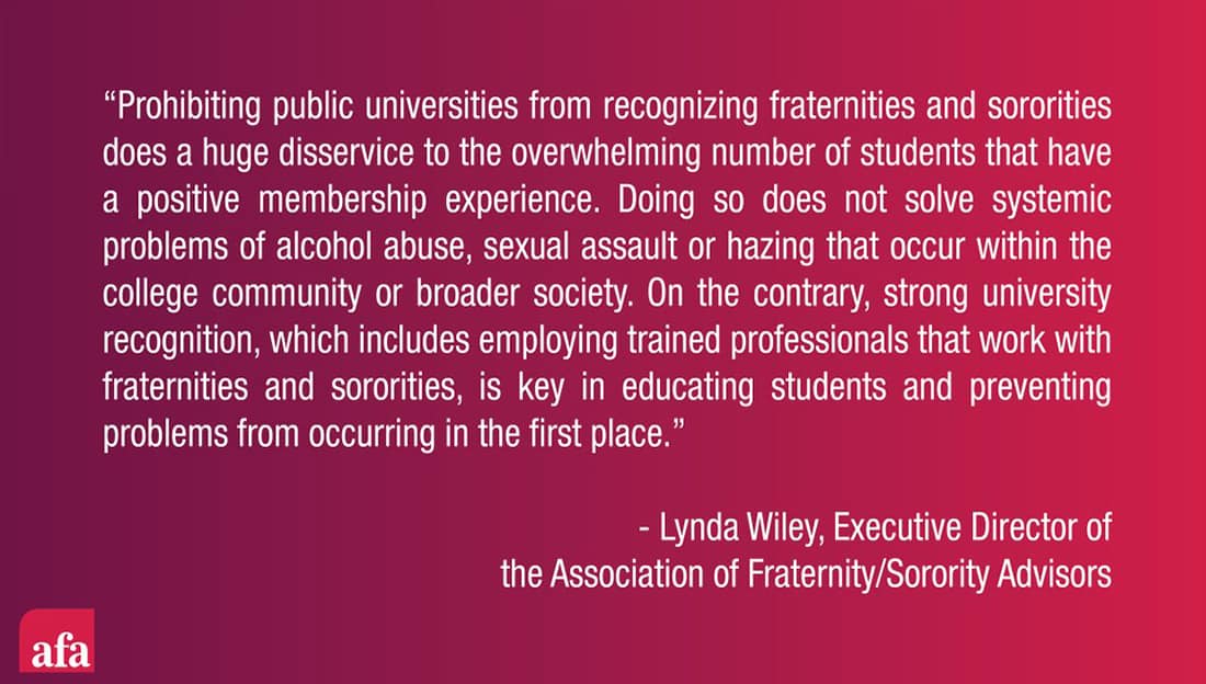 “Prohibiting public universities from recognizing fraternities and sororities does a huge disservice to the overwhelming number of students that have a positive membership experience. Doing so does not solve systemic problems of alcohol abuse, sexual assault or hazing that occur within the college community or broader society. On the contrary, strong university recognition, which includes employing trained professionals that work with fraternities and sororities, is key in educating students and preventing problems from occurring in the first place.”