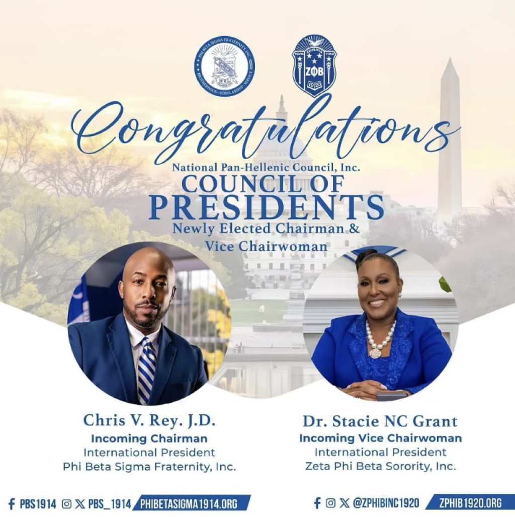 Phi Beta Sigma also shared the graphic to social media with the following caption. “Congratulations to Hon. Bro. Chris V. Rey, J.D., on his election as the Chairman and Dr. Stacie NC Grant on her role as Vice Chairwoman of the NPHC Council of Presidents. Phi Beta Sigma celebrates this outstanding achievement alongside our esteemed sisters of Zeta Phi Beta Sorority, Inc. Our united Blue and White bond inspires leadership and collaboration across the globe.”