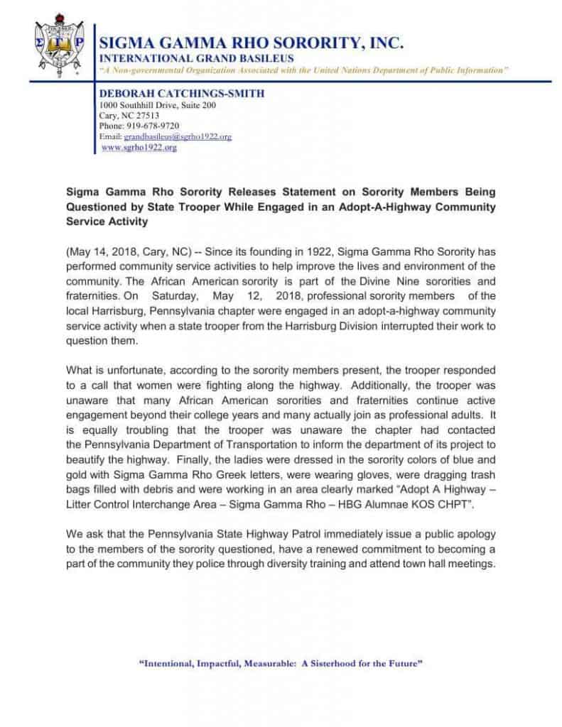 The national headquarters of Sigma Gamma Rho Sorority, Inc. released an official statement today about the sorority members who were stopped and questioned by state troopers while participation in an adopt-a-highway community service activity in Harrisburg, Pennsylvania.