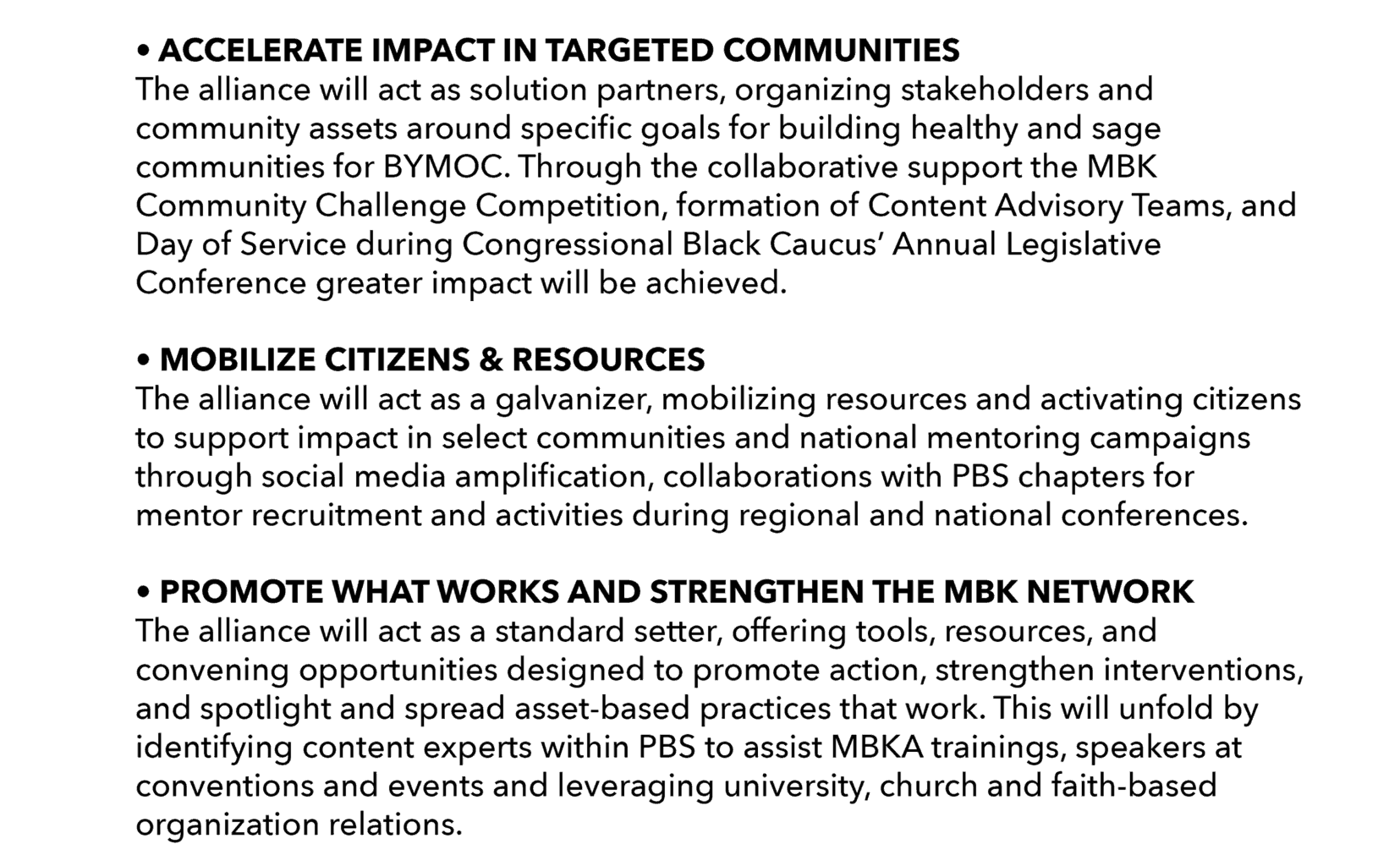 According to the document released by Phi Beta Sigma, the fraternity will work together with MBKA to advance their work by taking the following three strategic approaches.