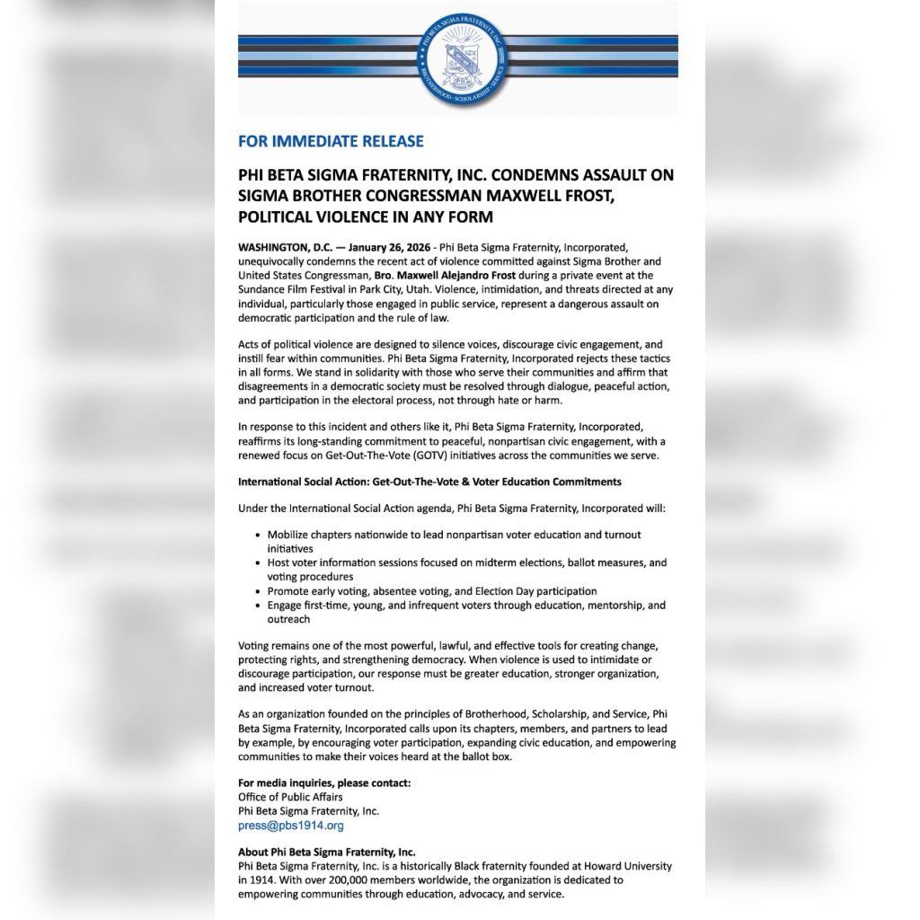 Phi Beta Sigma Fraternity, Incorporated has issued a public statement condemning a recent act of violence against their fraternity brother U.S. Congressman Maxwell Alejandro Frost, reaffirming its opposition to political violence in all forms.