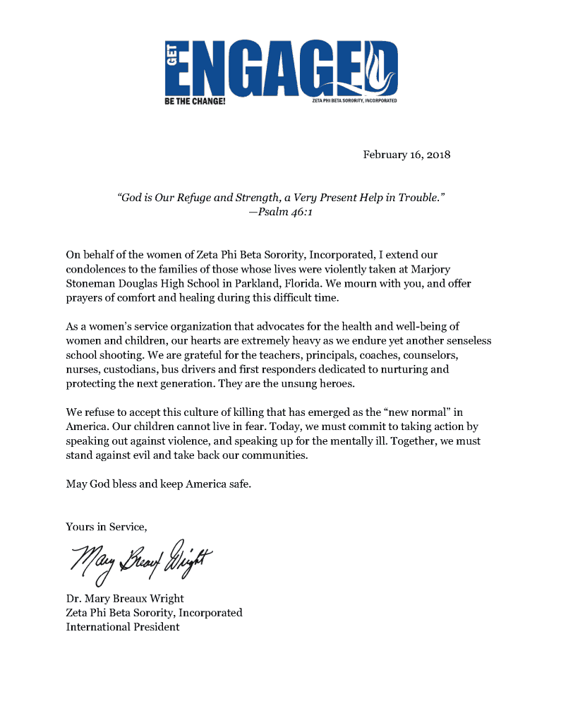 Dr. Mary Breaux Wright, the International President of Zeta Phi Beta recently released a public statement on behalf of the sorority regarding the school shooting at Marjory Stoneman Douglass High School in Parkland, Florida.