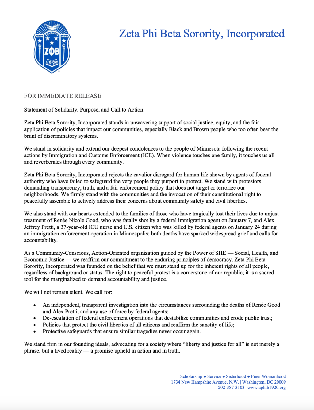 Zeta Phi Beta also issued a series of specific calls to action, including an independent and transparent investigation into the deaths of Renée Good and Alex Pretti, de-escalation of federal enforcement operations that destabilize communities, policies that protect civil liberties, and safeguards to prevent similar tragedies in the future.